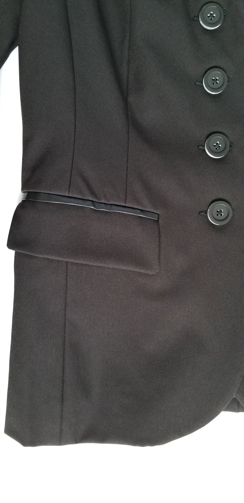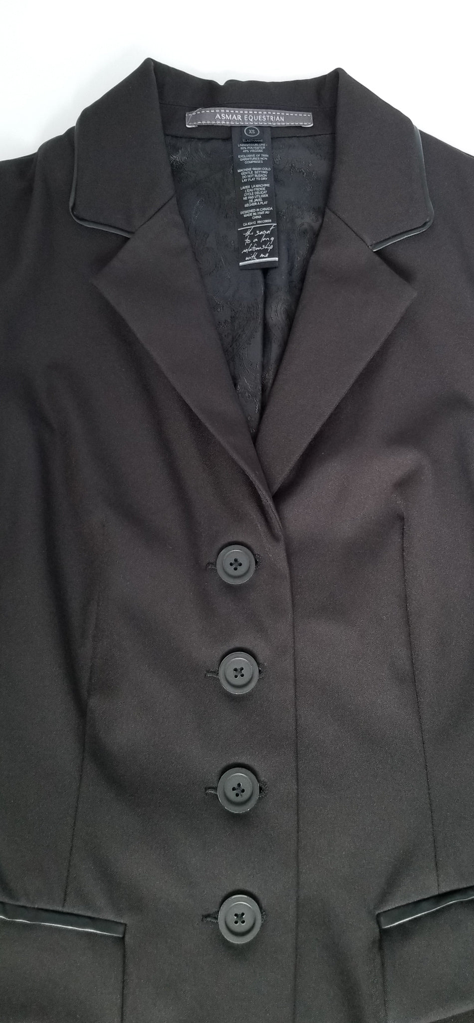 Stunning black show jacket from Asmar Equestrian. Four button front with four buttons on sleeves. Single flap in rear. No detail overlooked: faux leather trim around collar and pockets, as well as thick buttons on front and sleeves with branding on the sides.