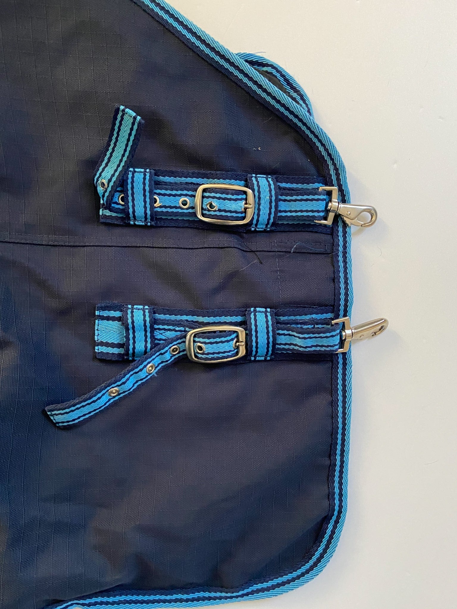 Zero fill stable sheet with adjustable front closure and belly straps.