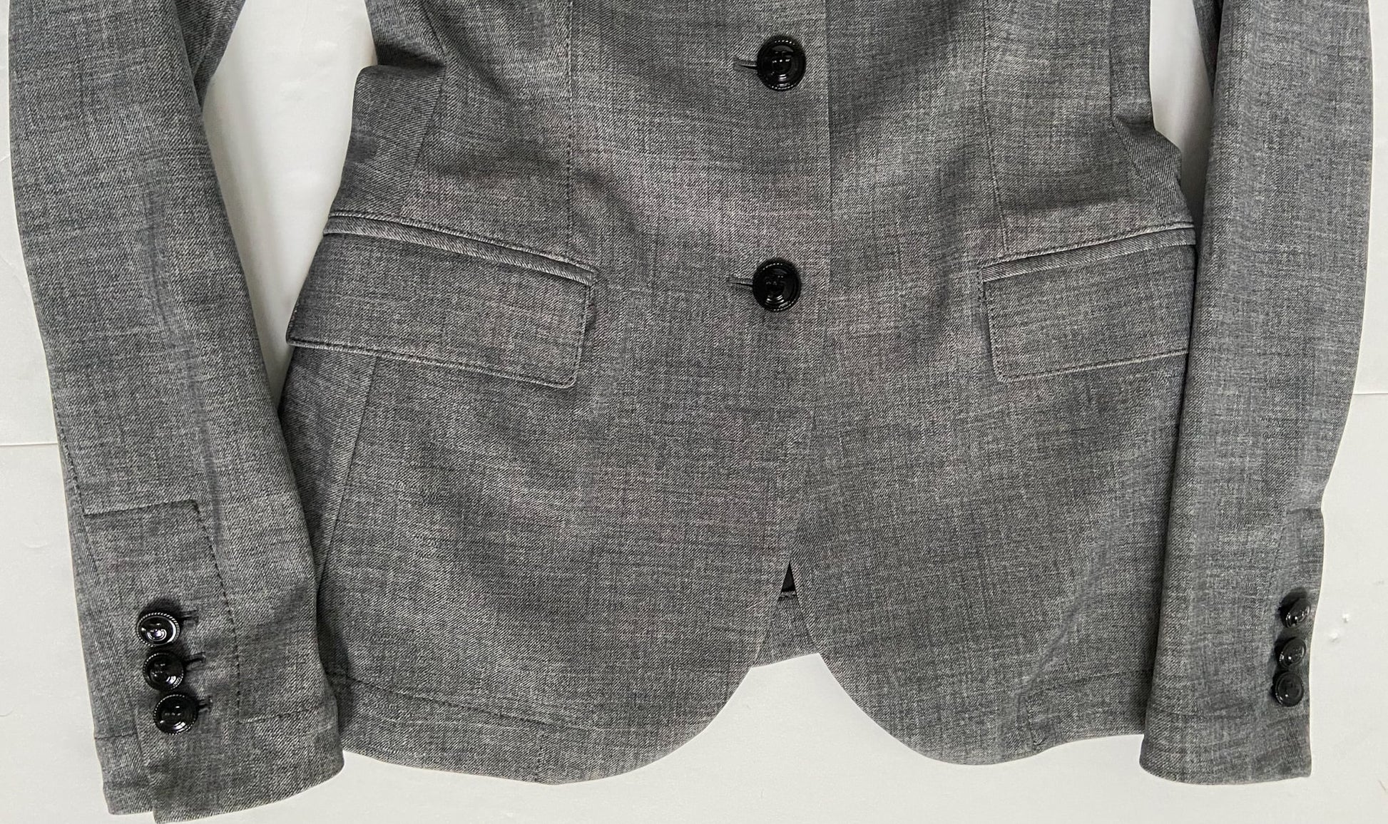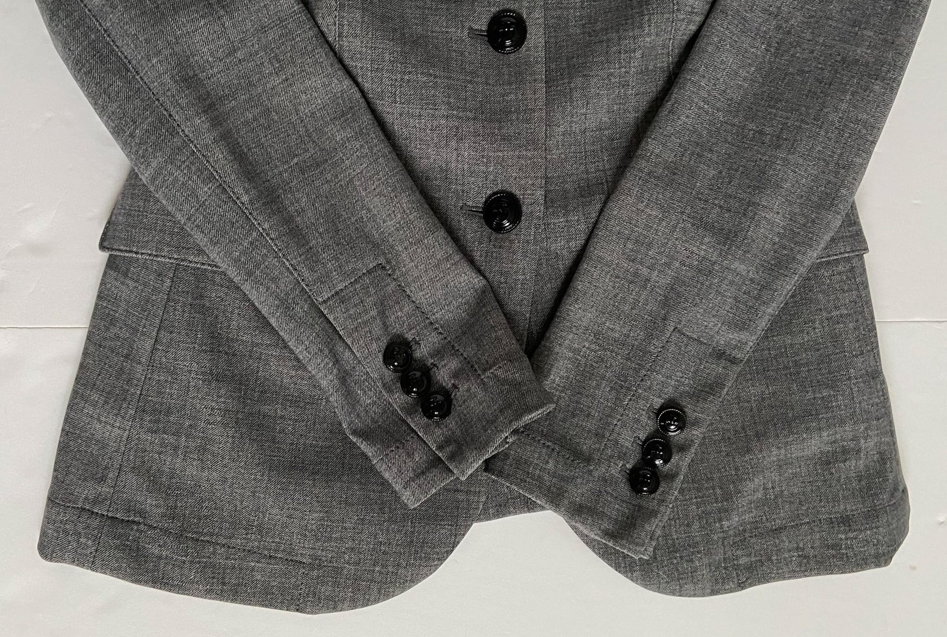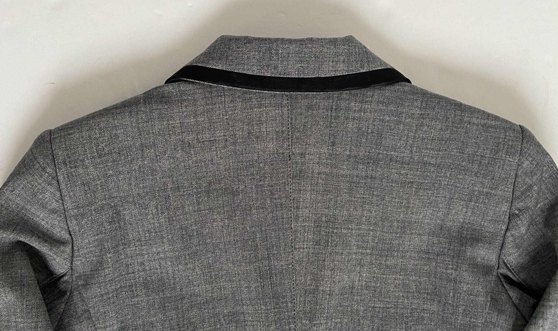 Gorgeous heathered grey show jacket that features black piping around the collar and black buttons. Front seams make this jacket super flattering.