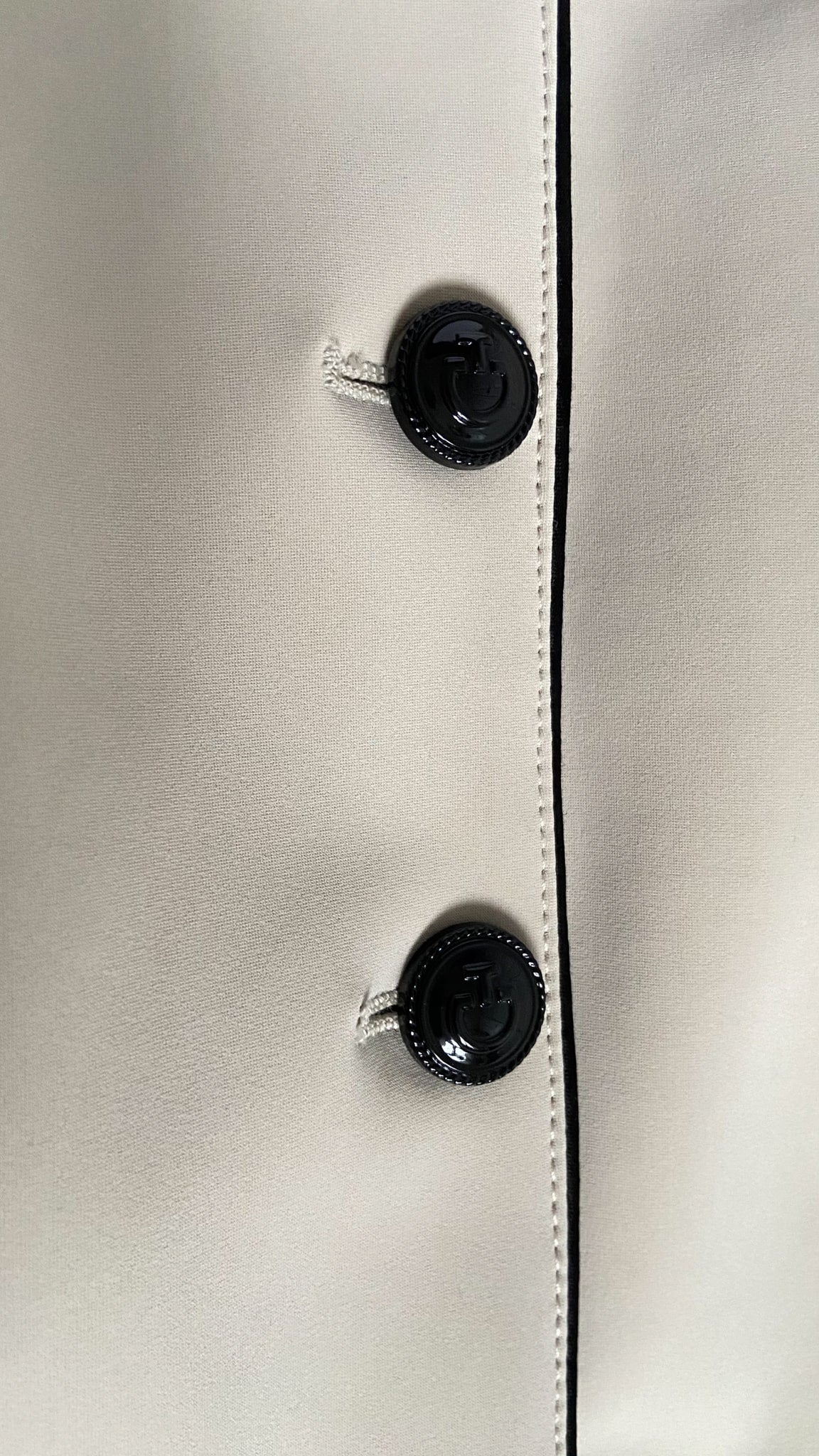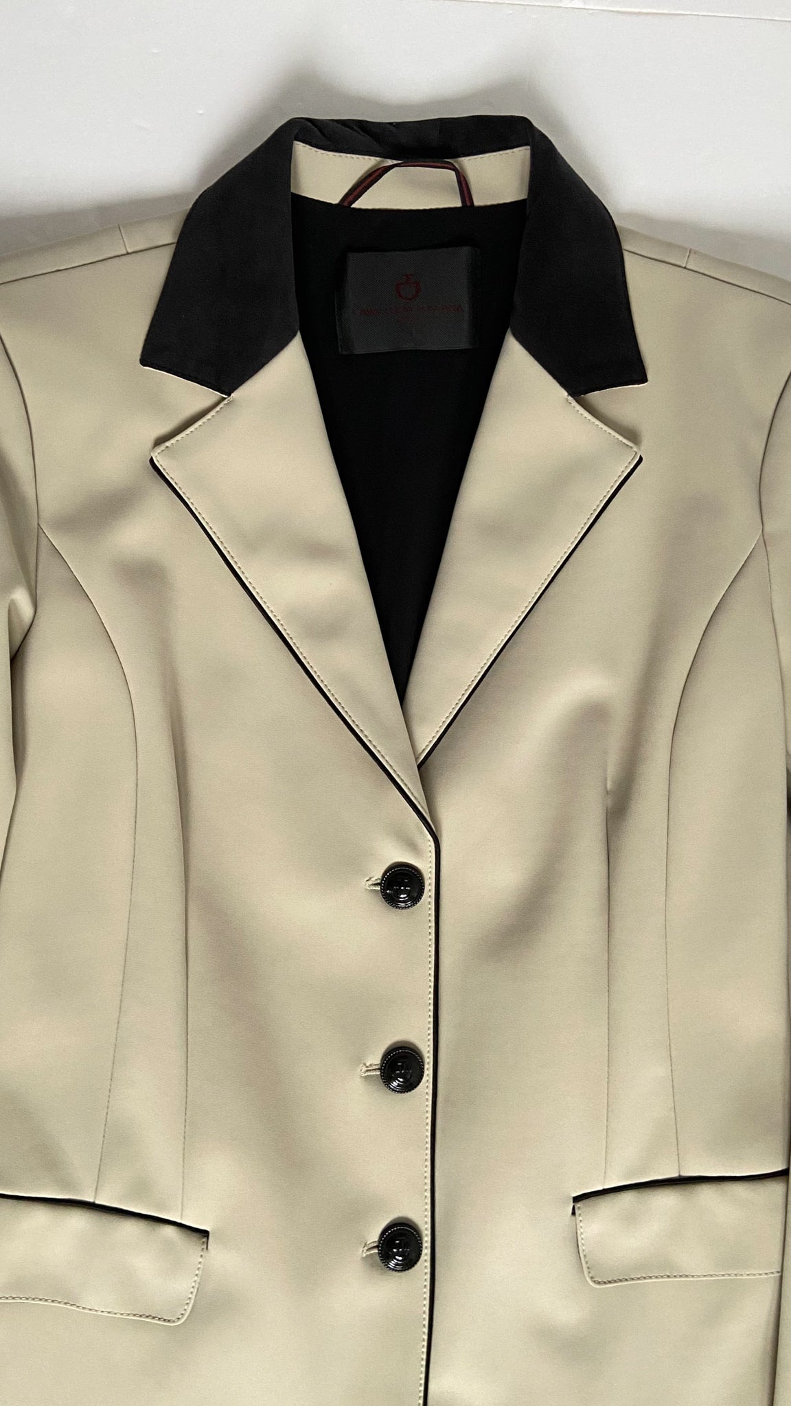 Stunning tan show jacket that features black alcantara collar, black buttons, and black piping. Front seams make this jacket super flattering.