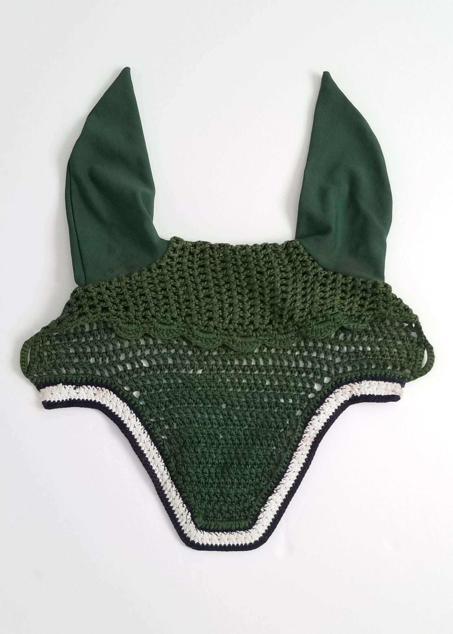 Infamous De La Coeur bonnet. Gorgeous hunter green colour with white and black border. Navy rhinestone row makes this bonnet pop. Cute owl embroidery on left ear.