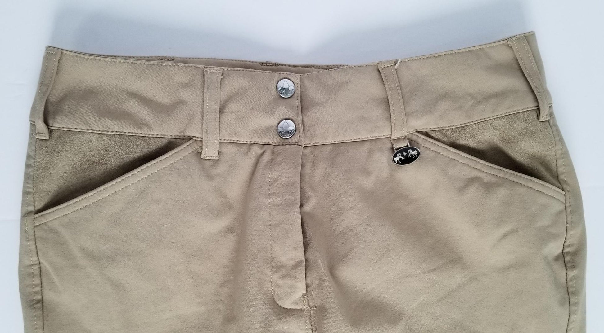 Simple tan, front zip breeches with classical knee patch and euro seat. Sock bottoms for added comfort. Suede detailing on inner pockets.