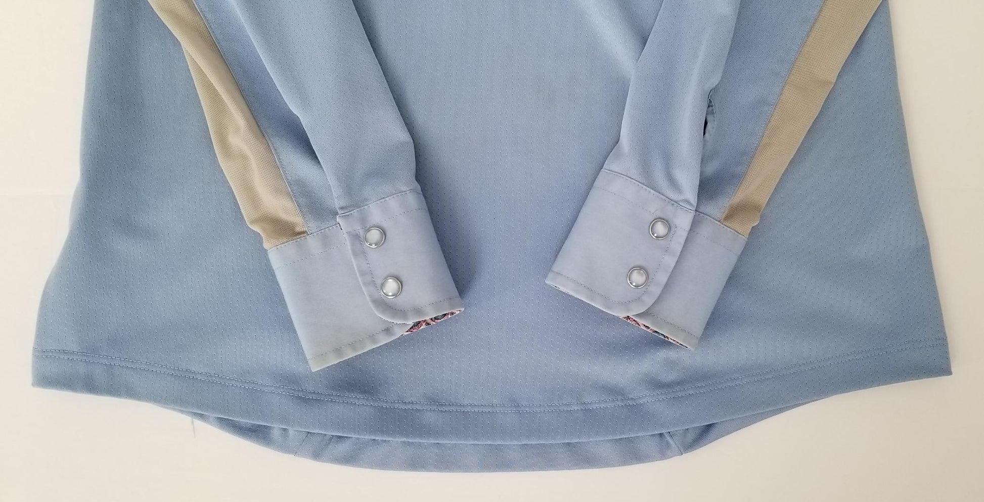 Flattering Essex show shirt. Performance material with mesh under arms and a snap collar. Fun floral design under collar and cuffs.
