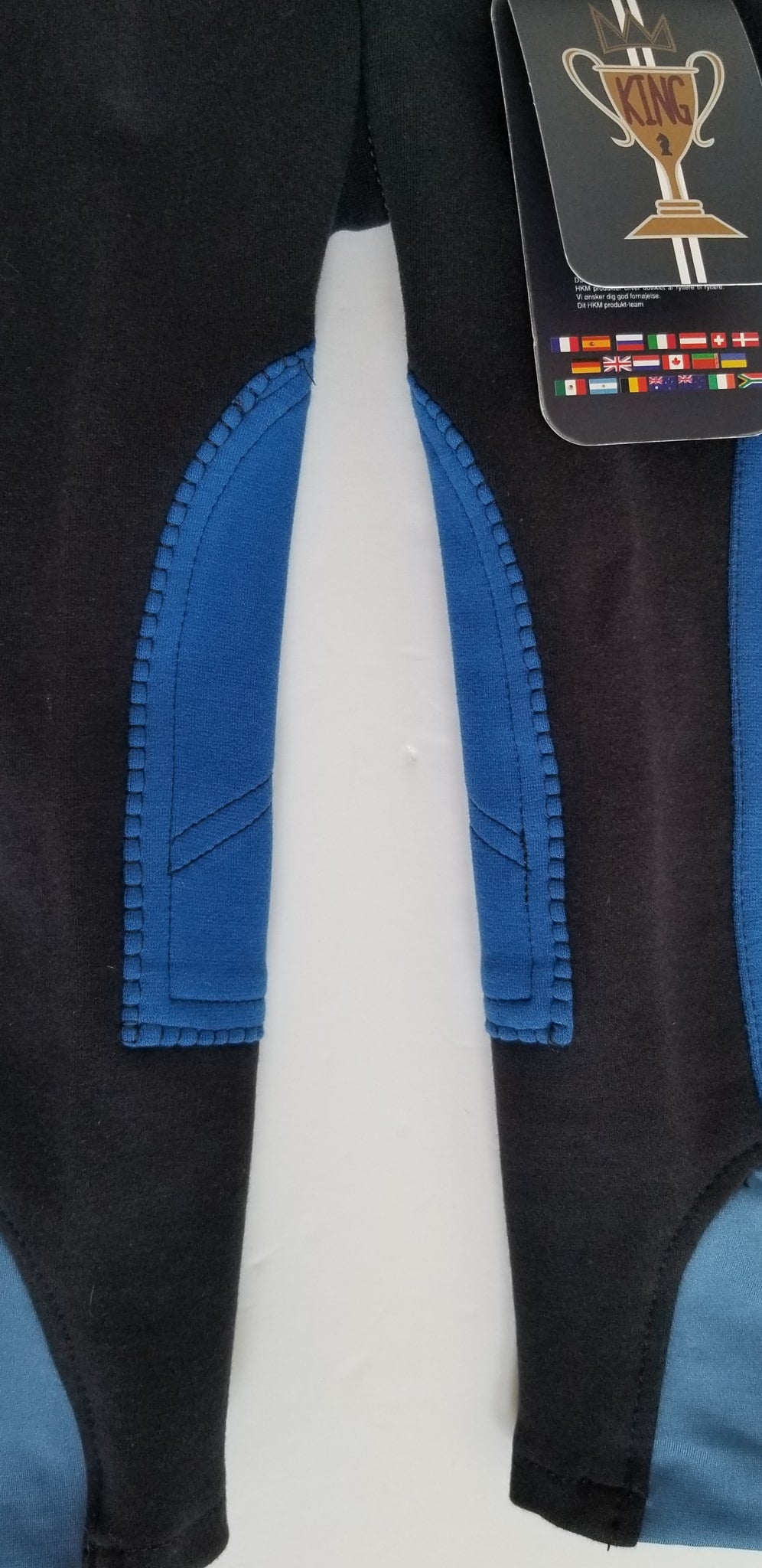 High quality kids breeches that feature a light blue knee patch and sock bottoms.