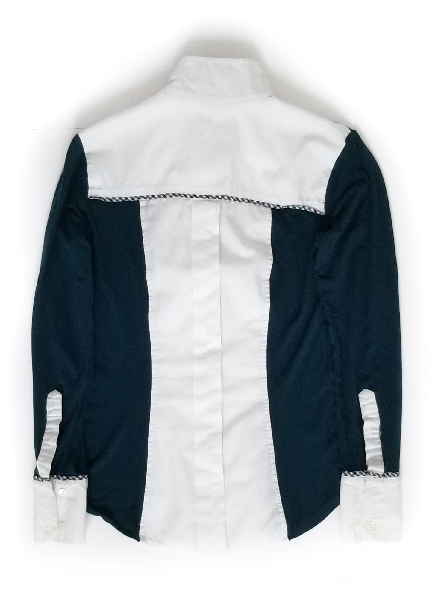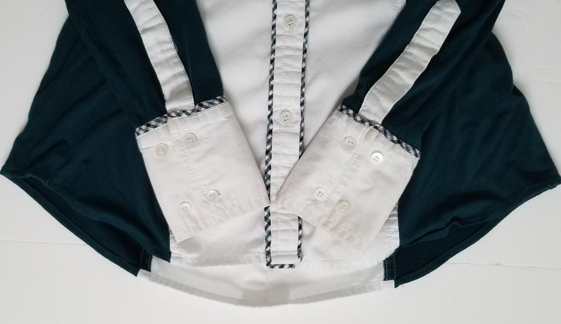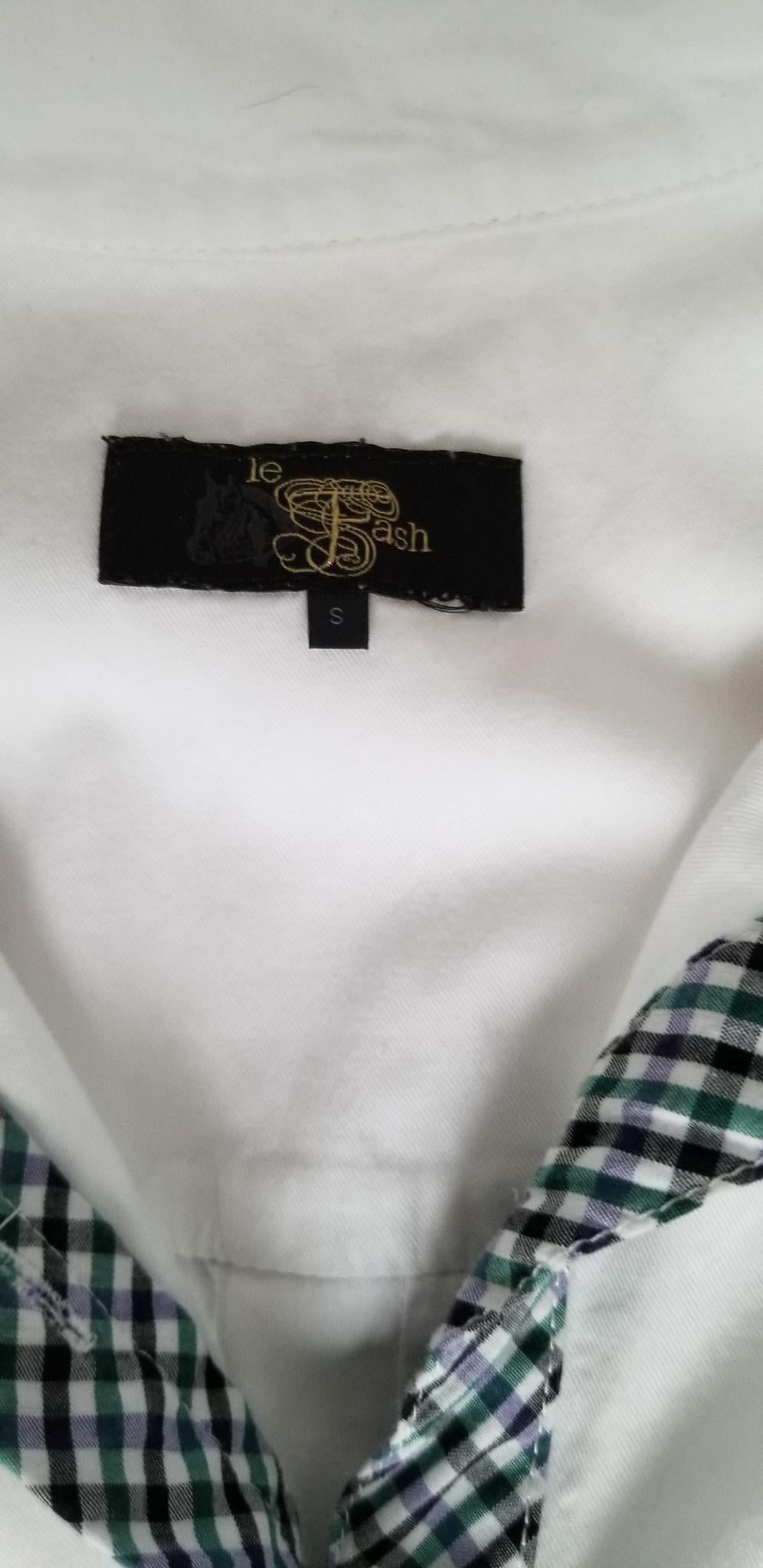 Gorgeous Le Fash show shirt. Jersey like hunter green material, with crisp white front. Plaid detailing on trim and a magnetic collar. High quality shirt for the show ring!