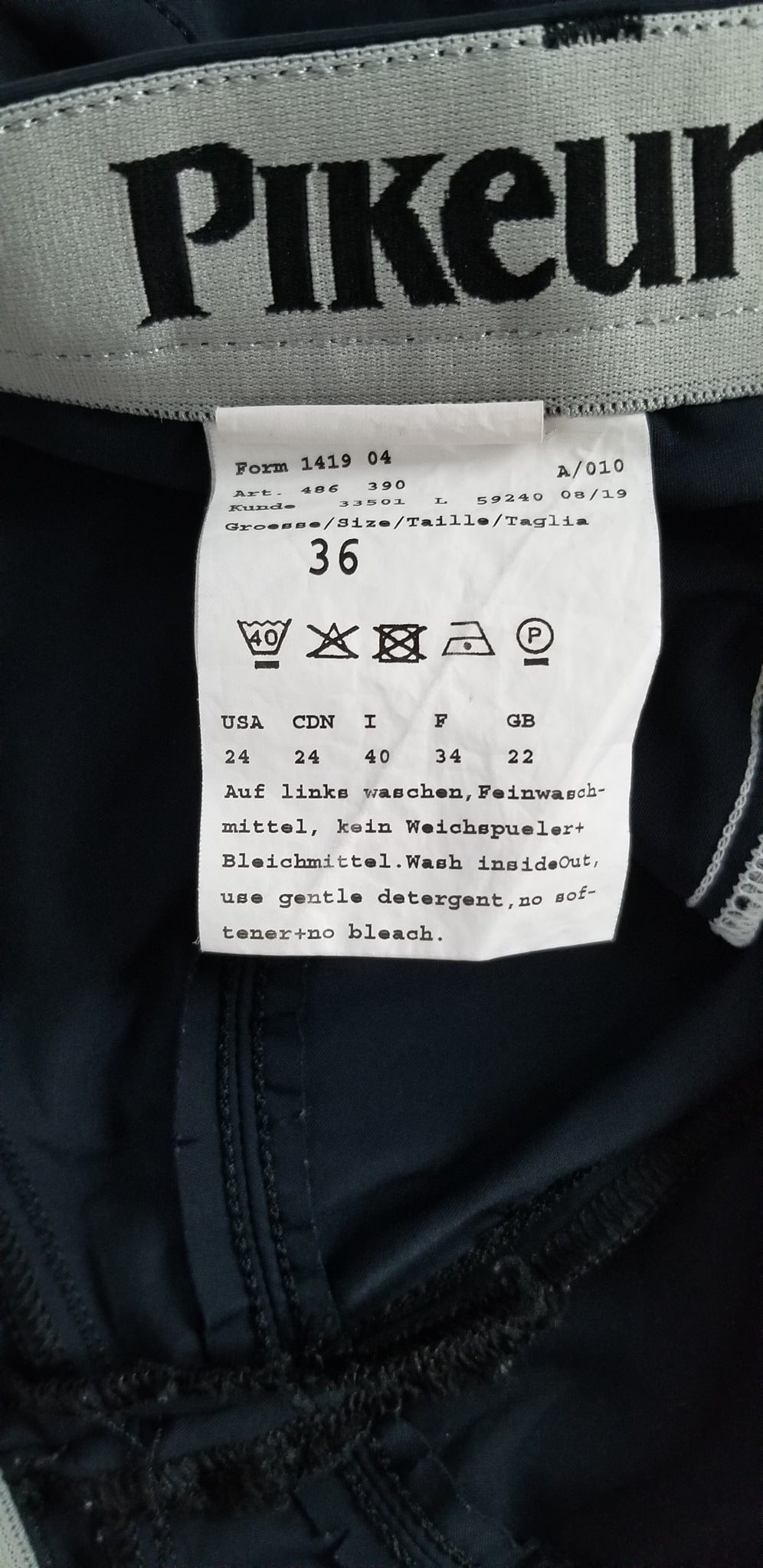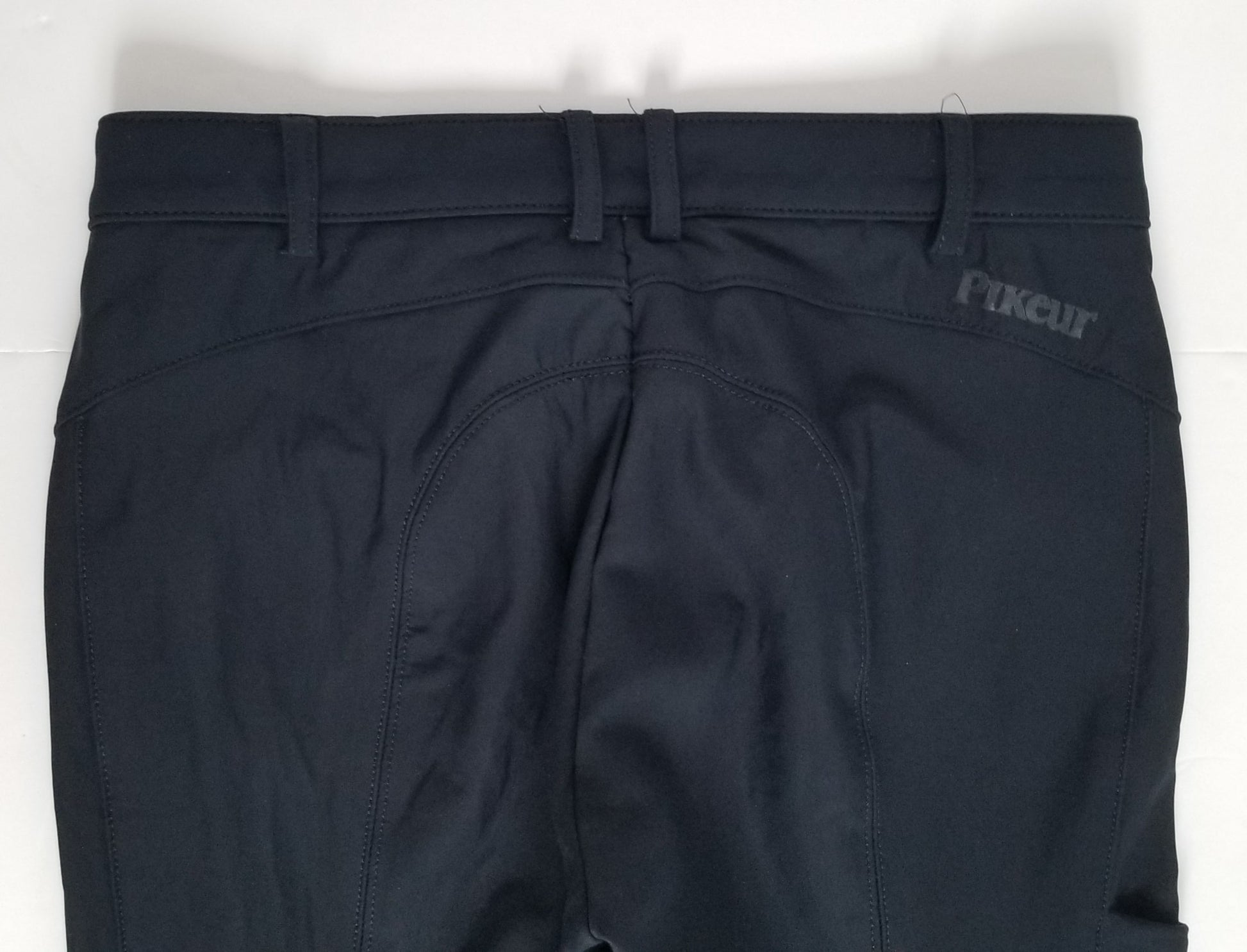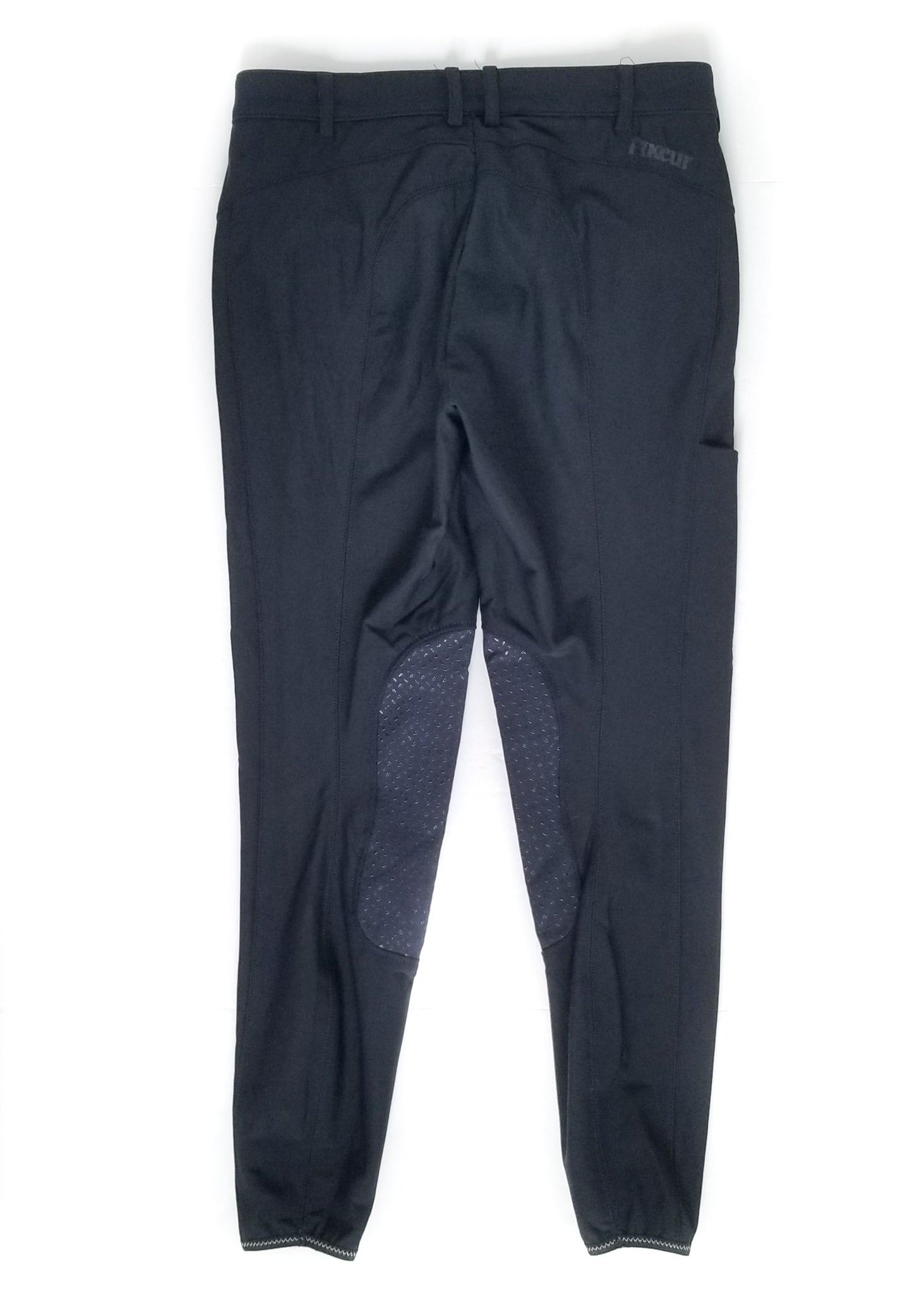 Technical Pikeur breeches with silicone knee patch, elastic bottoms and cell phone pocket.