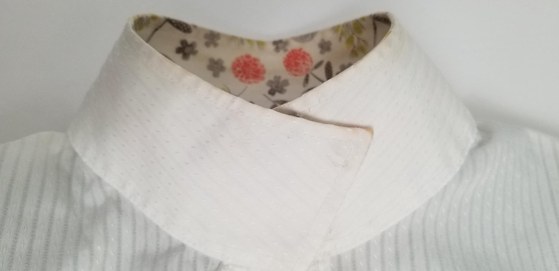 Fun grey show shirt yet only the white is seen when wearing a jacket! Lightweight material with snap collar.