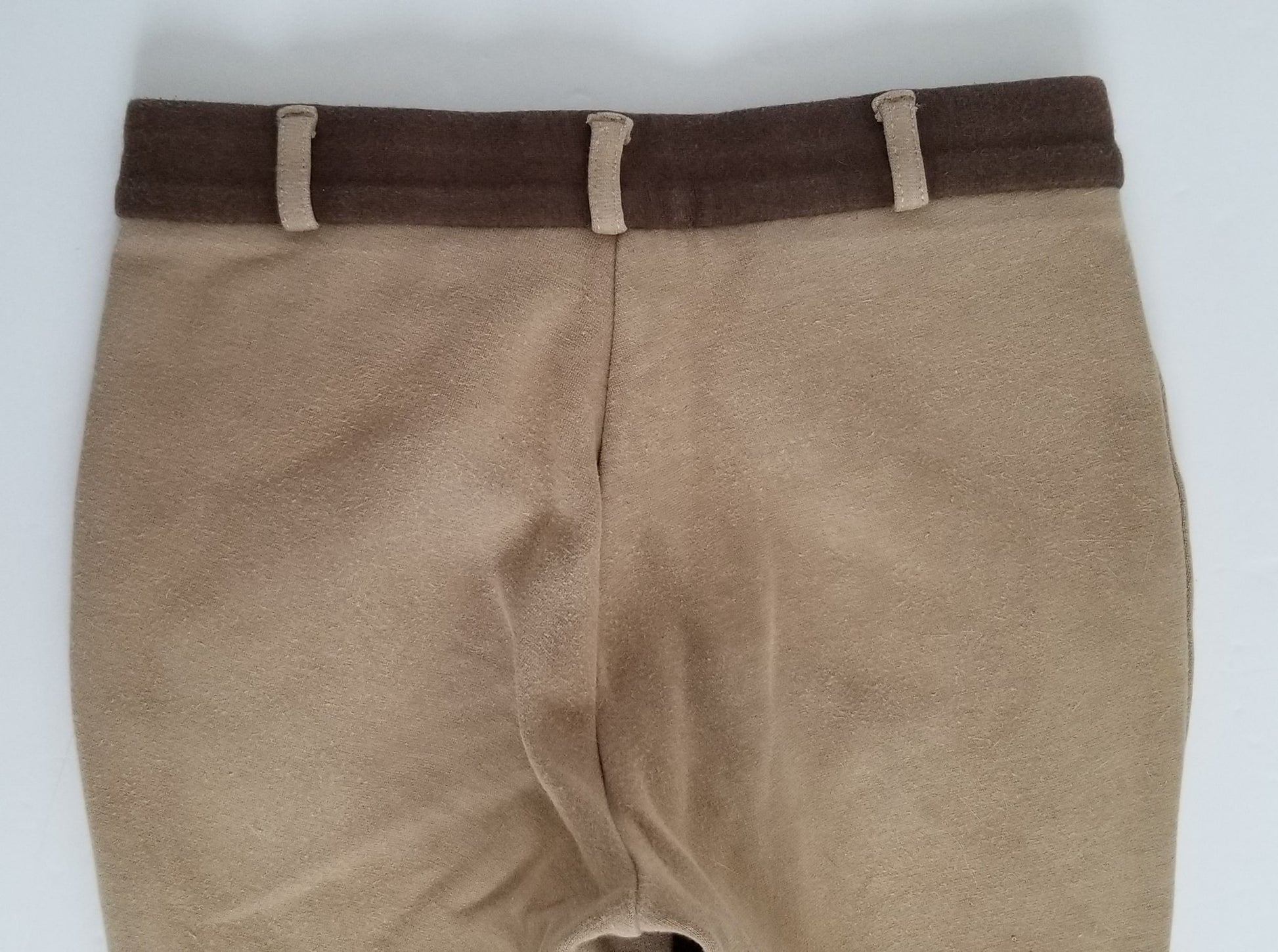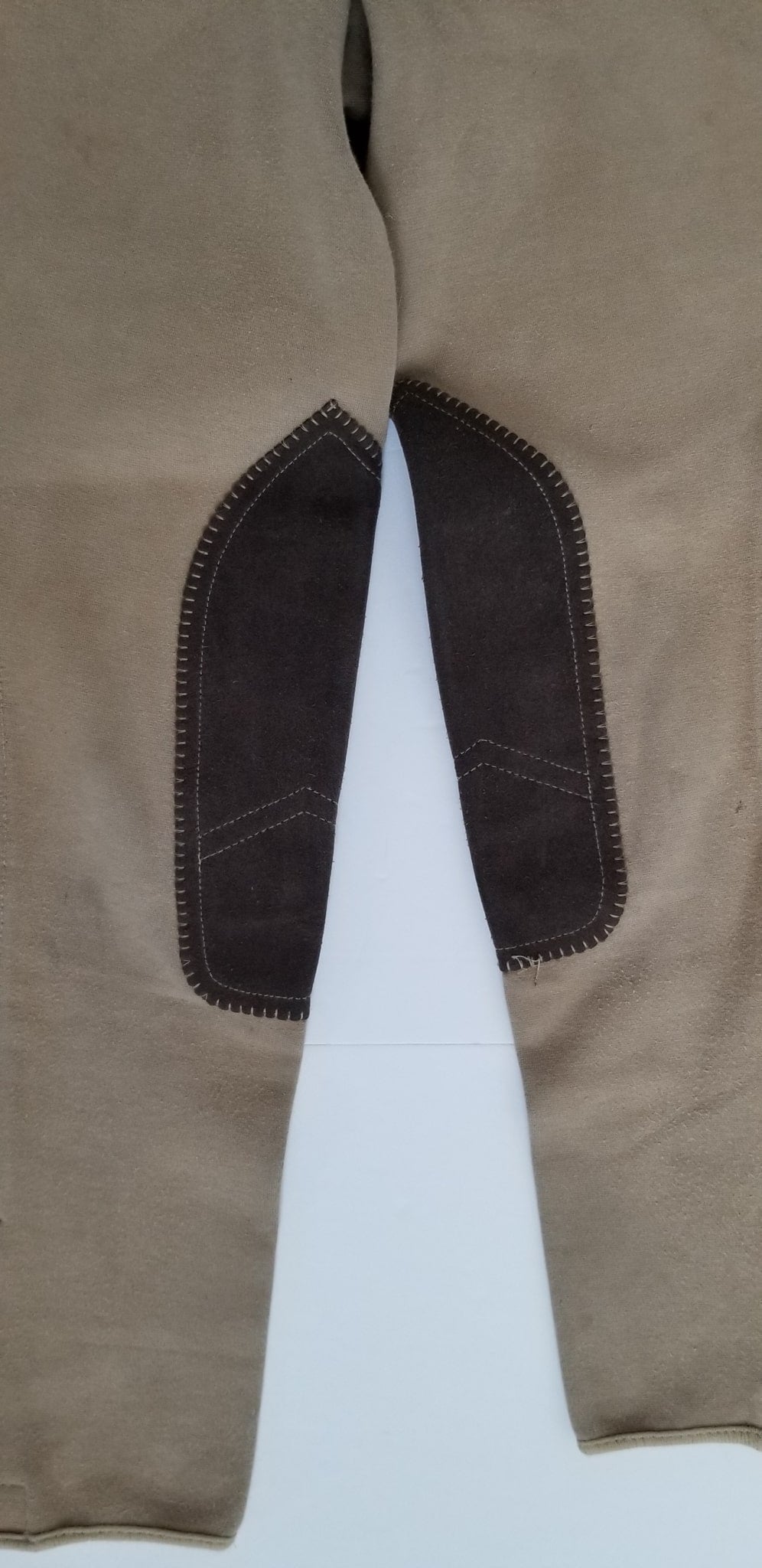 Classic tan breeches with contrast brown knee patches, front zipper pockets, and velcro bottoms.